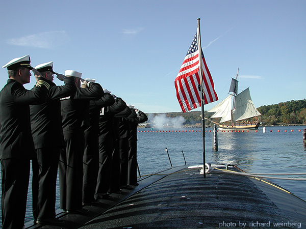 After presenting my the idea of a sail by salute slute with Mayor Lomabardi, it was decided to proceed, establish a namesake partnership with the boat, and since I volunteered, the task was mine. This was a tribute to bridge the years, with a sail by cannon salute from the Sloop Providence to the USS Providence. The namesake partnership promoted both the morale of the city and that of the crew. Now this was done to spark cooperation and provide diversity to our web site and recognize the Commander and crew. |